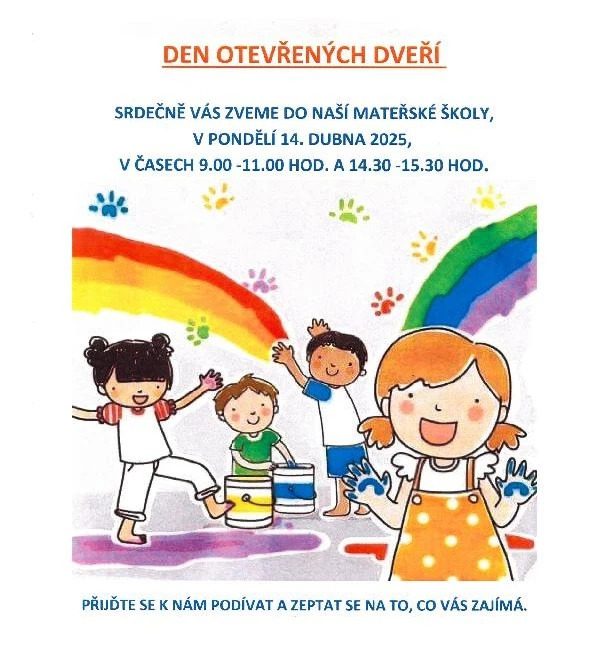 Srdečně vás zveme do naší mateřské školy, v pondělí 14. dubna 2025, v časech 9.00 – 11.00 hod. a 14.30 – 15.30 hod.