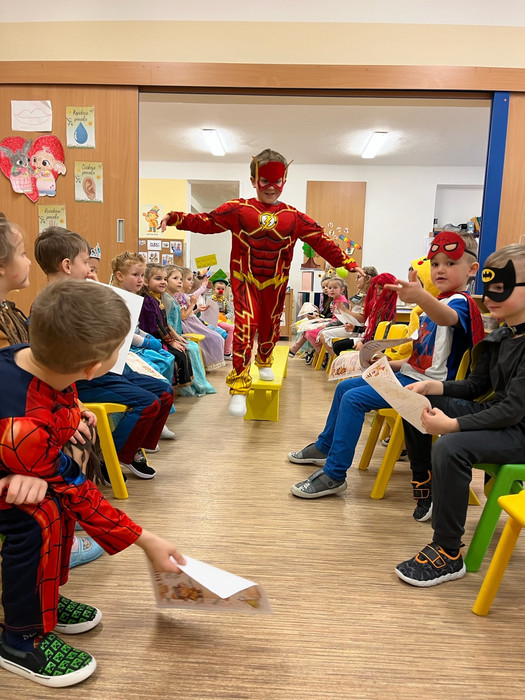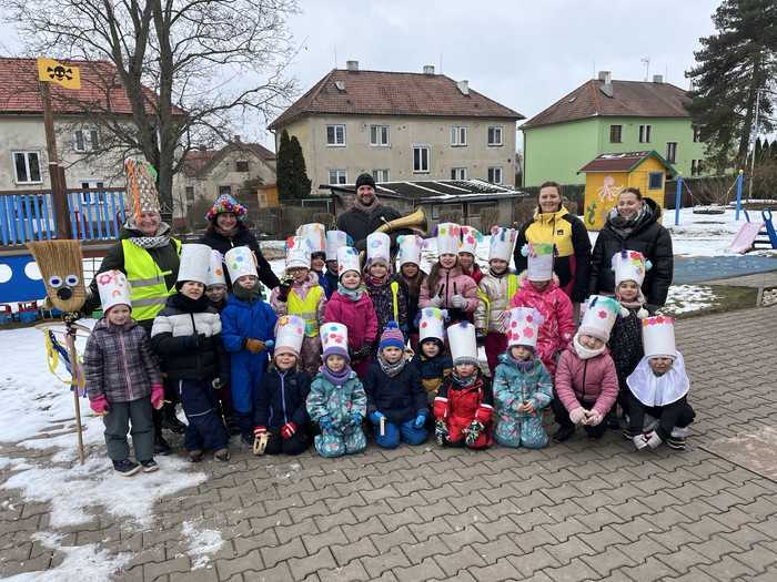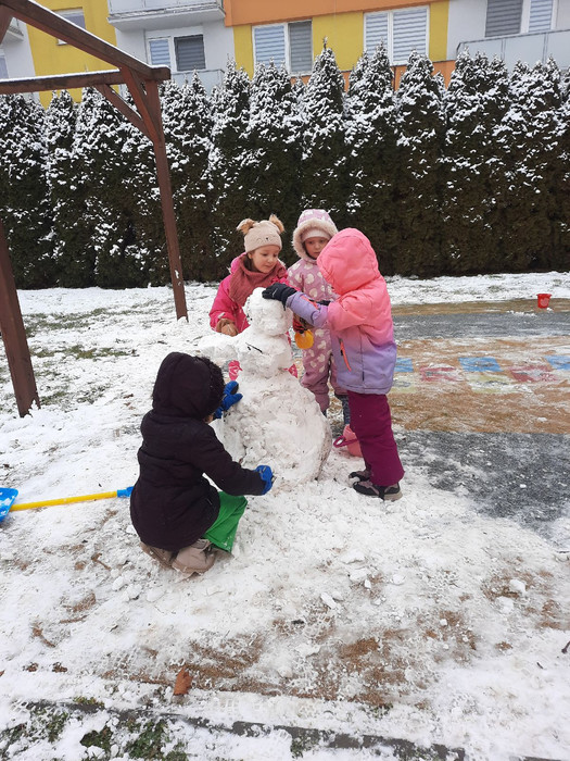 Ať je léto nebo zima, ve školce je vždycky príma. Ráno s úsměvem se vítáme, kamarády kolem sebe máme. Stavíme věže, kreslíme, zpíváme, nové věci každý den poznáváme.